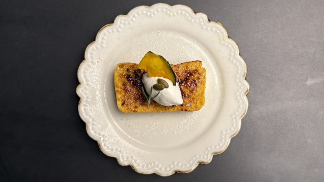 クリームチーズやホワイトチョコを合わせてしっとり焼き上げ、上質なカソナードを炙って香ばしいブリュレに。さらにローストかぼちゃの種とチップスでアクセント。