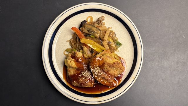 のソースと合わせました。付け合わせには韓国春雨と野菜のチャプチェを。いろいろな食感をお楽しみください。