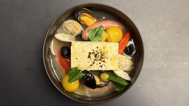 魚介ベースの出汁にソーセージやお野菜、オリーブなどを煮込みオリーブオイルでまとめました。