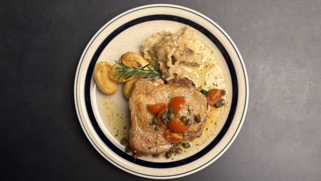 香ばしく焦がしたバターをベースに、トマト・ケーパー・ワインビネガー・パセリを加え、醤油で仕上げた特製ソースを合わせました。