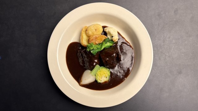 牛肉を赤ワインで一晩マリネし、表面を香ばしく焼き上げた後、香味野菜とともにじっくり煮込みました。